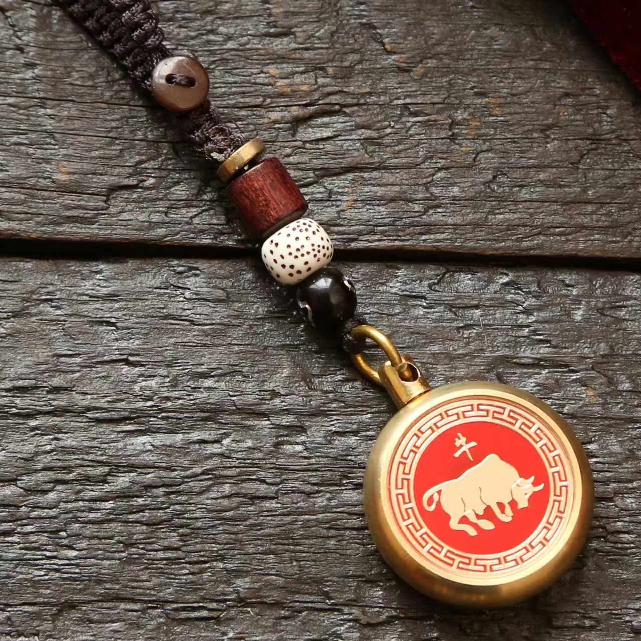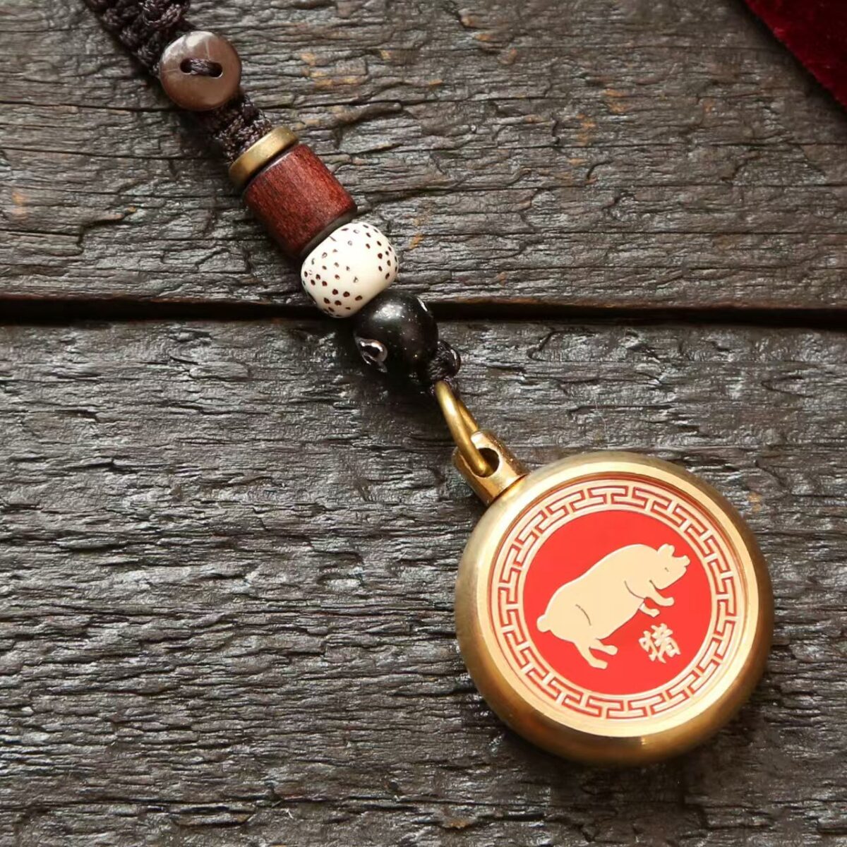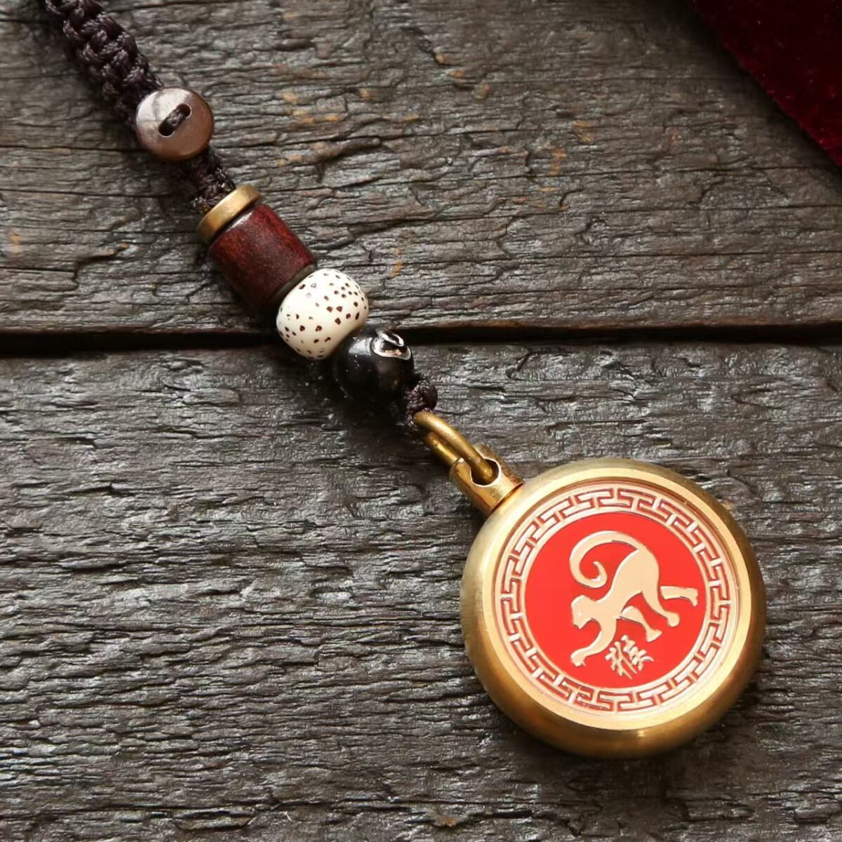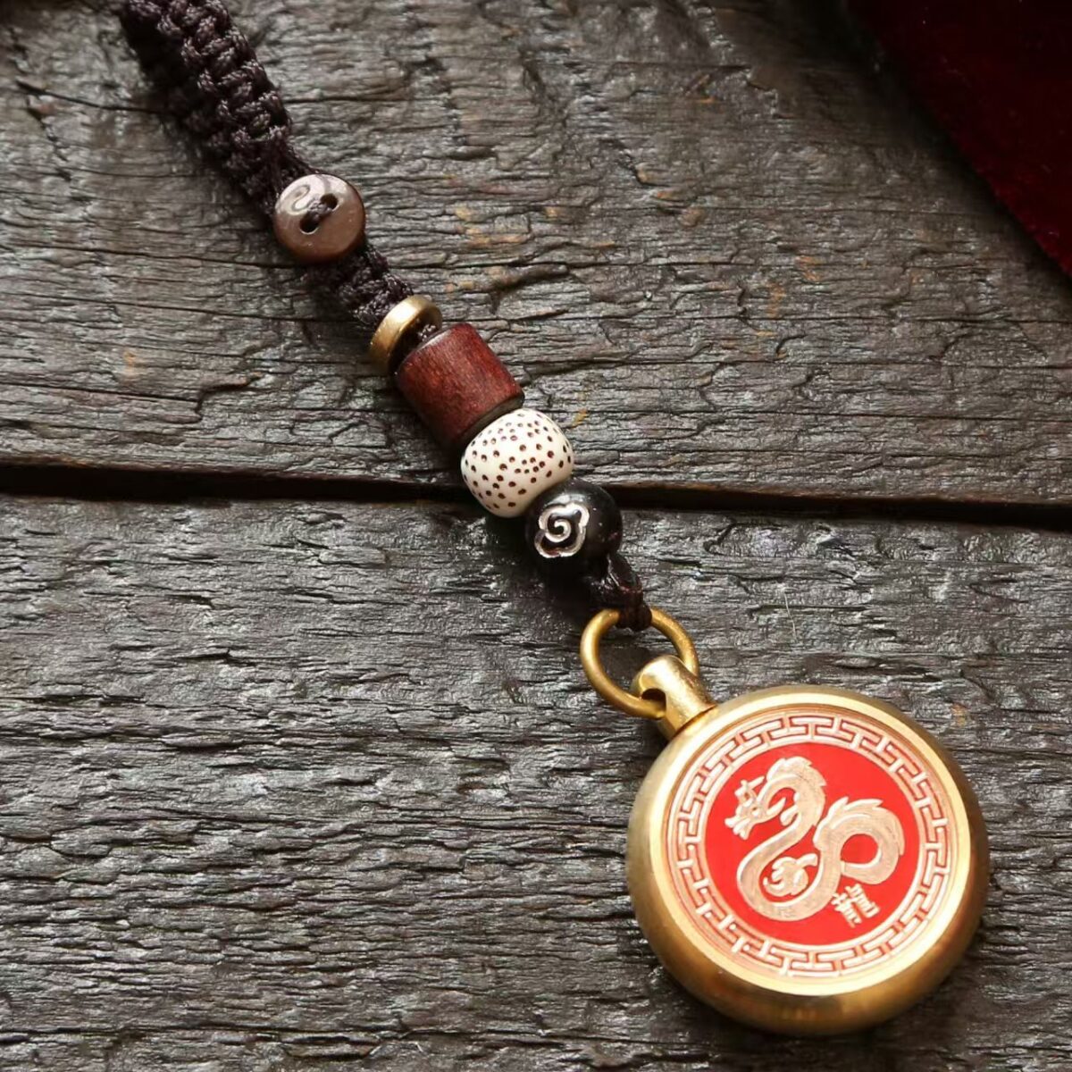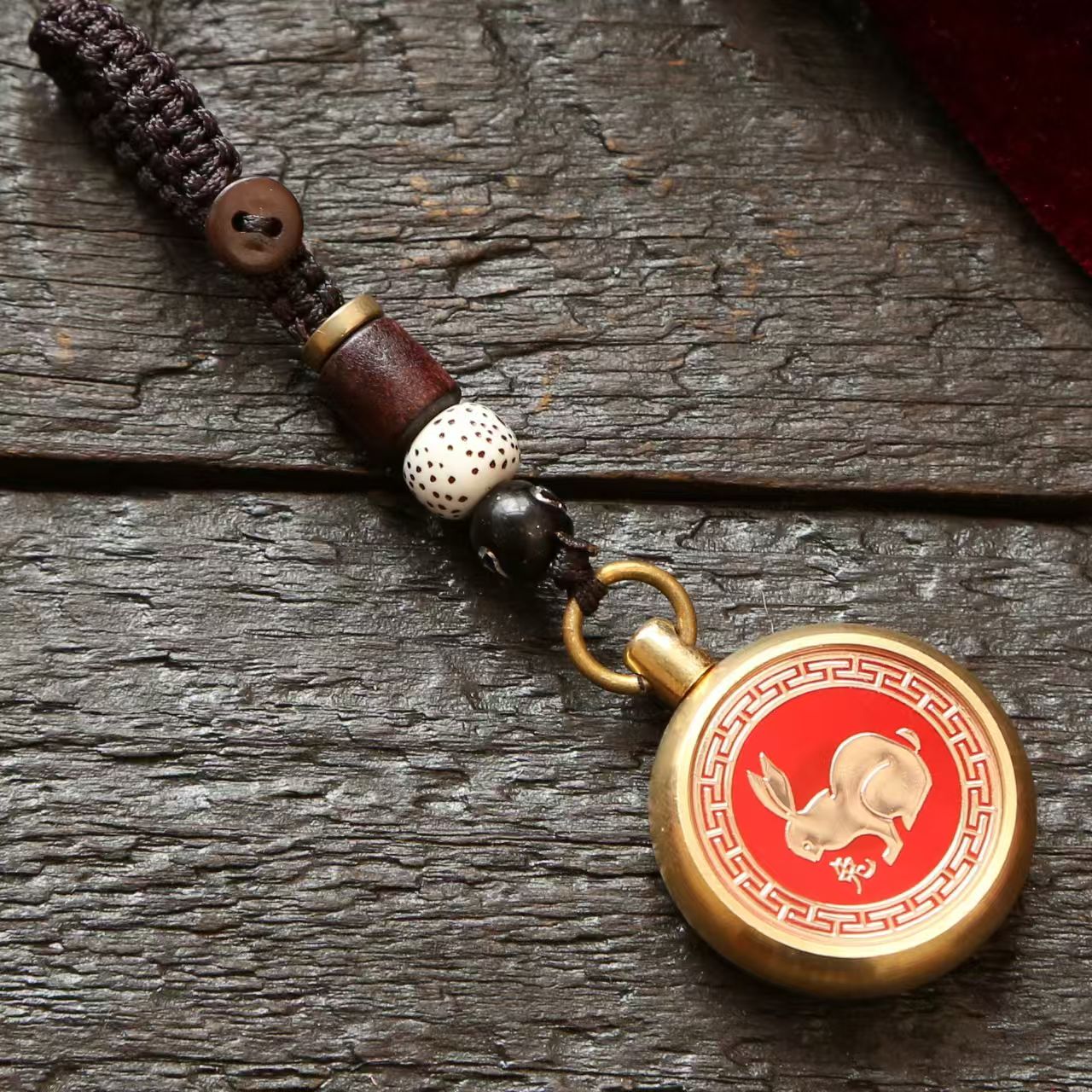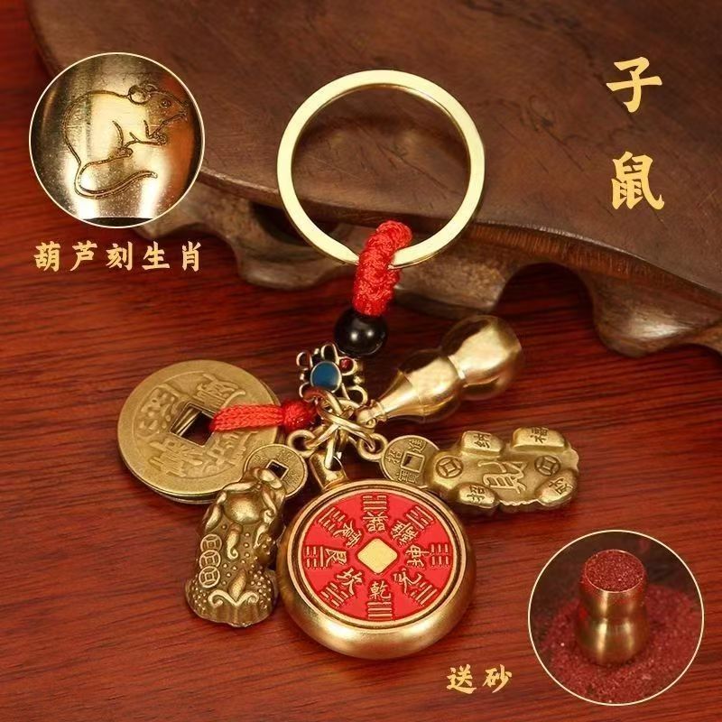 黃銅十二生肖中國紅轉轉招財進寶鑰匙扣吊墜復古轉運轉錢掛飾